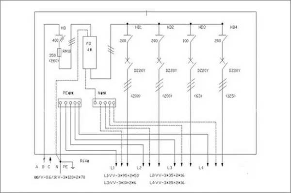 1級配電箱指從變壓器引入三相電源、接地線和零線。