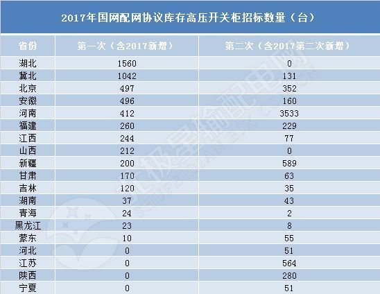2017年,全國電網配電網設備協議庫存開關柜類設備共被邀請4次,主要是高壓開關柜類設備,共邀請招標11540臺。其中,首次高壓開關柜(含2017年新增)招標涉及15家省級公司,共計5307臺。第二高電壓開關柜(包括第二次新增)有17家省級電網公司參與,共6233臺。投標前后的投標數量差異很小,而且相對穩定。根據中國國家電網公司2018年發布的統計數據,高壓開關柜競價的數量為6499臺。由此可見,高壓量開關柜在國家電網配電網設備協議清單投標中保持了一定的穩定性。