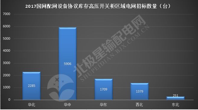 近年來,隨著電力發展步伐的加快,中國電網也發展迅速。電網系統運行電壓水平不斷提高,網絡規模不斷擴大。中國電網運行區域已形成覆蓋不同省份的五大區域電網,即東北電網、華北電網、華中電網、華東電網和西北電網。2017年,參與國家電網配電網設備協議存儲欄斷路器招標的五個地區電網分布均勻。從下圖可以看出,華中電網的投標數量遙遙領先,有5906臺,占51.18%;華北、華東和西北電網的招標數量相對統一,從1000臺到2000臺不等。東北電網是最低的,只有251臺被邀請投標。